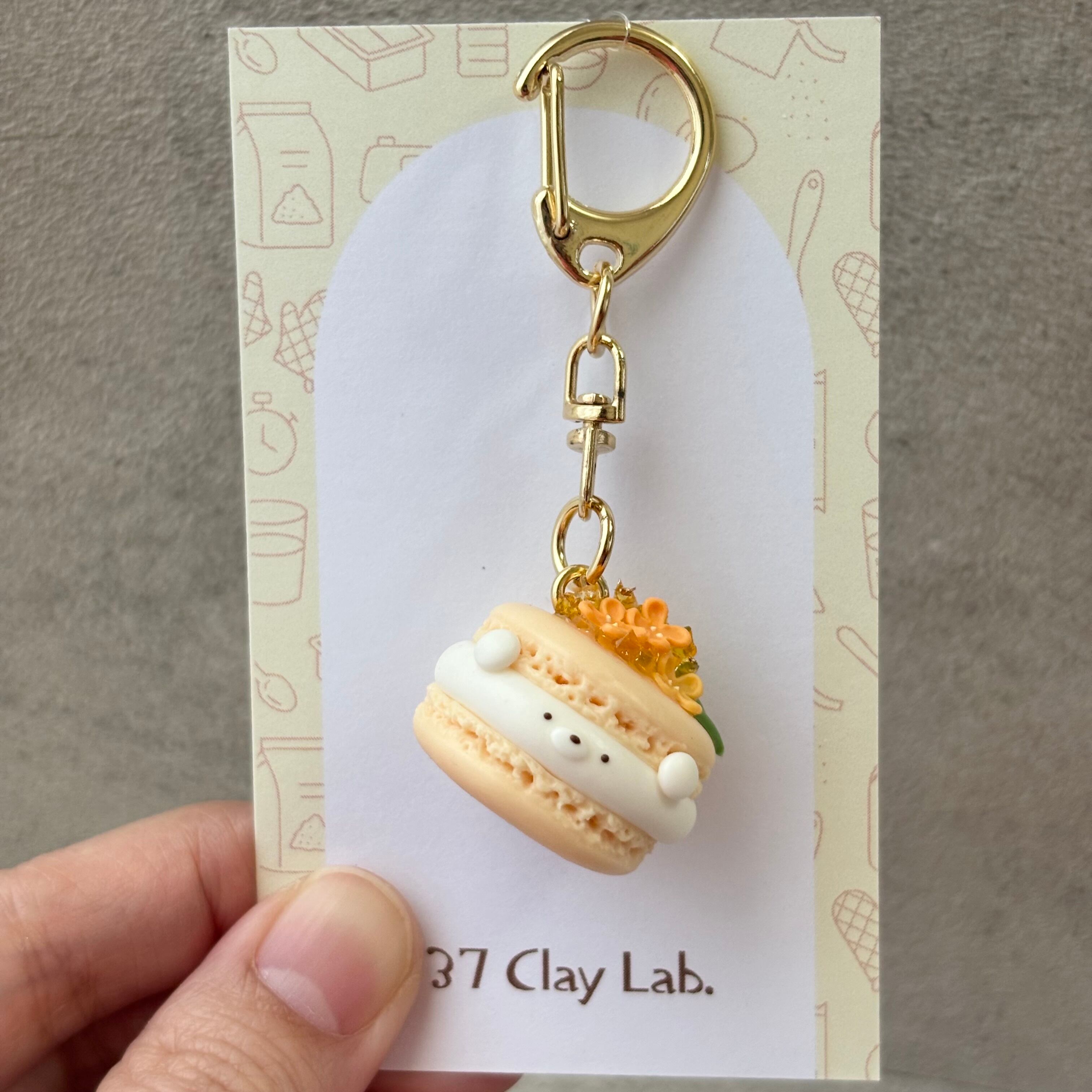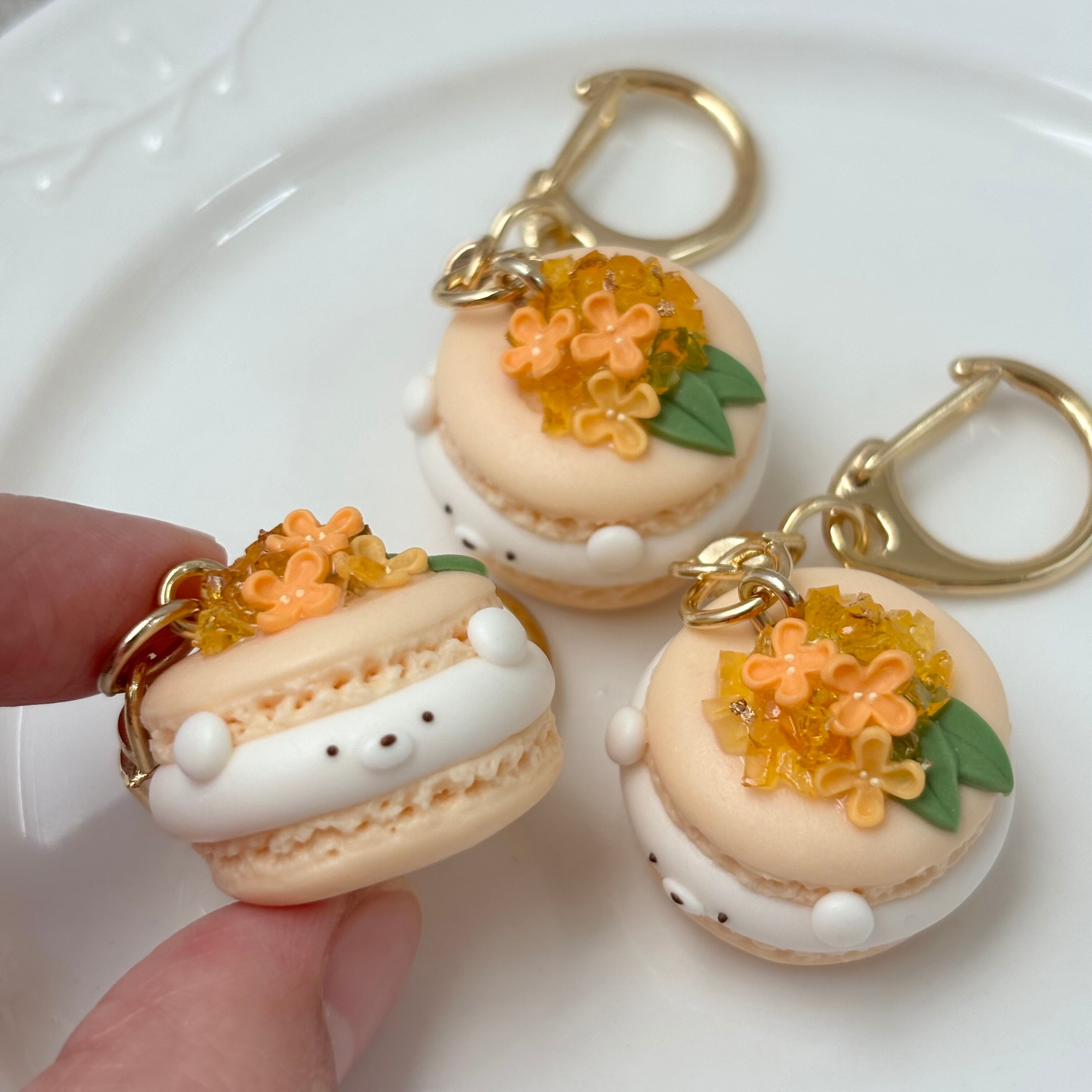 ちーくまを挟んだ金木犀のミニチュアマカロンキーホルダーです。